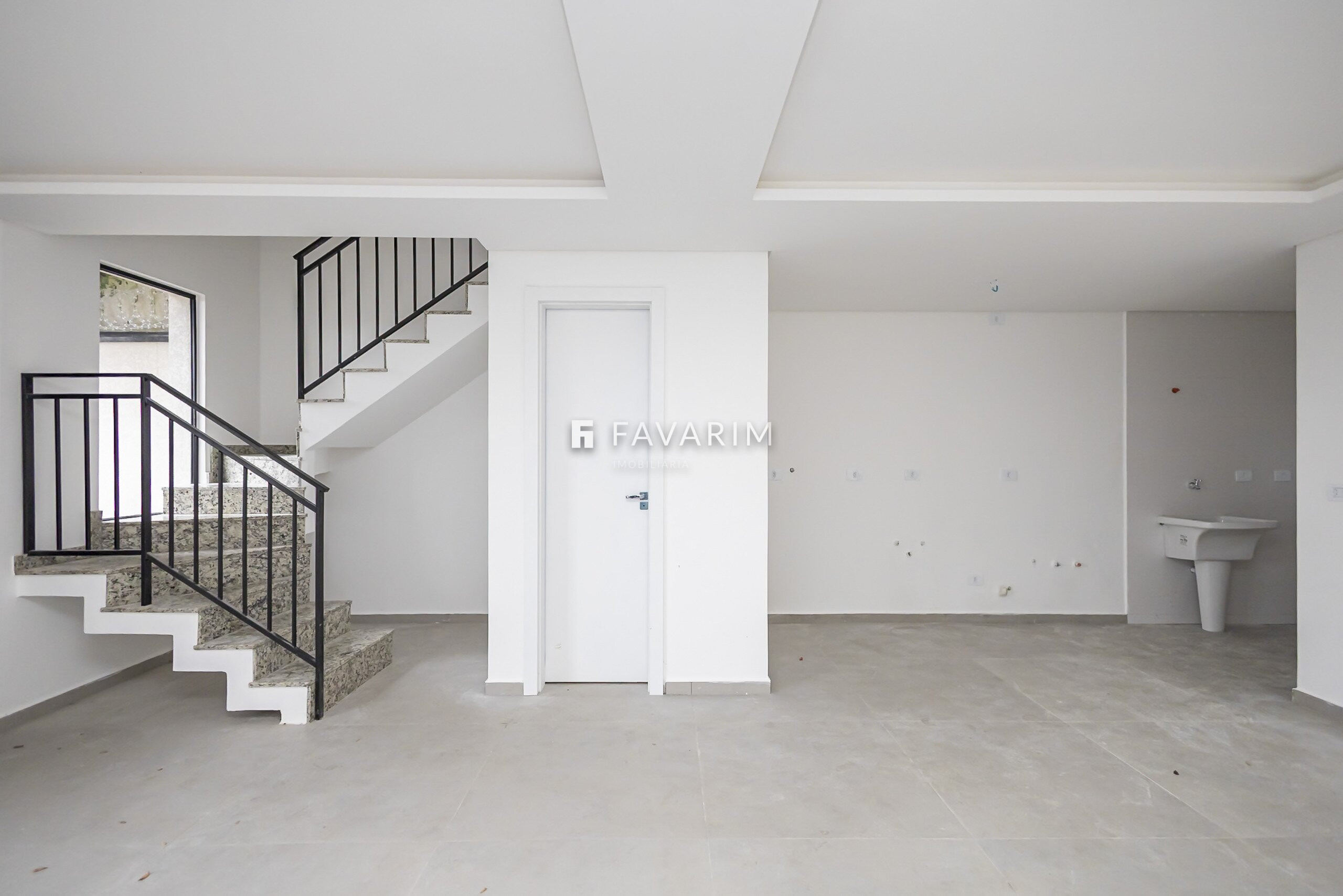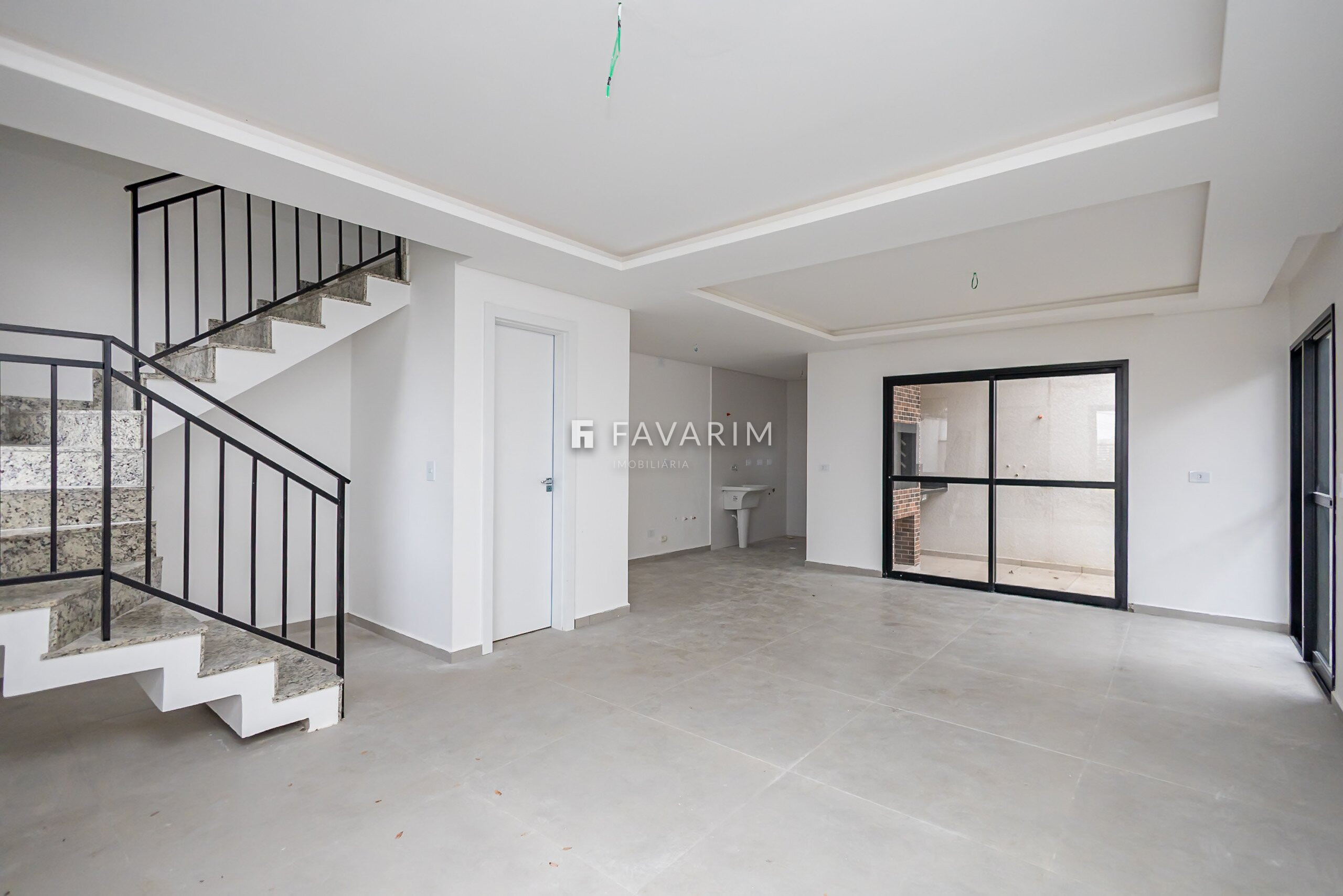 Pavimento térreo com sala jantar e estar conjugada a cozinha americana, lavanderia, lavabo, churrasqueira coberta e 2 vagas de garagem
